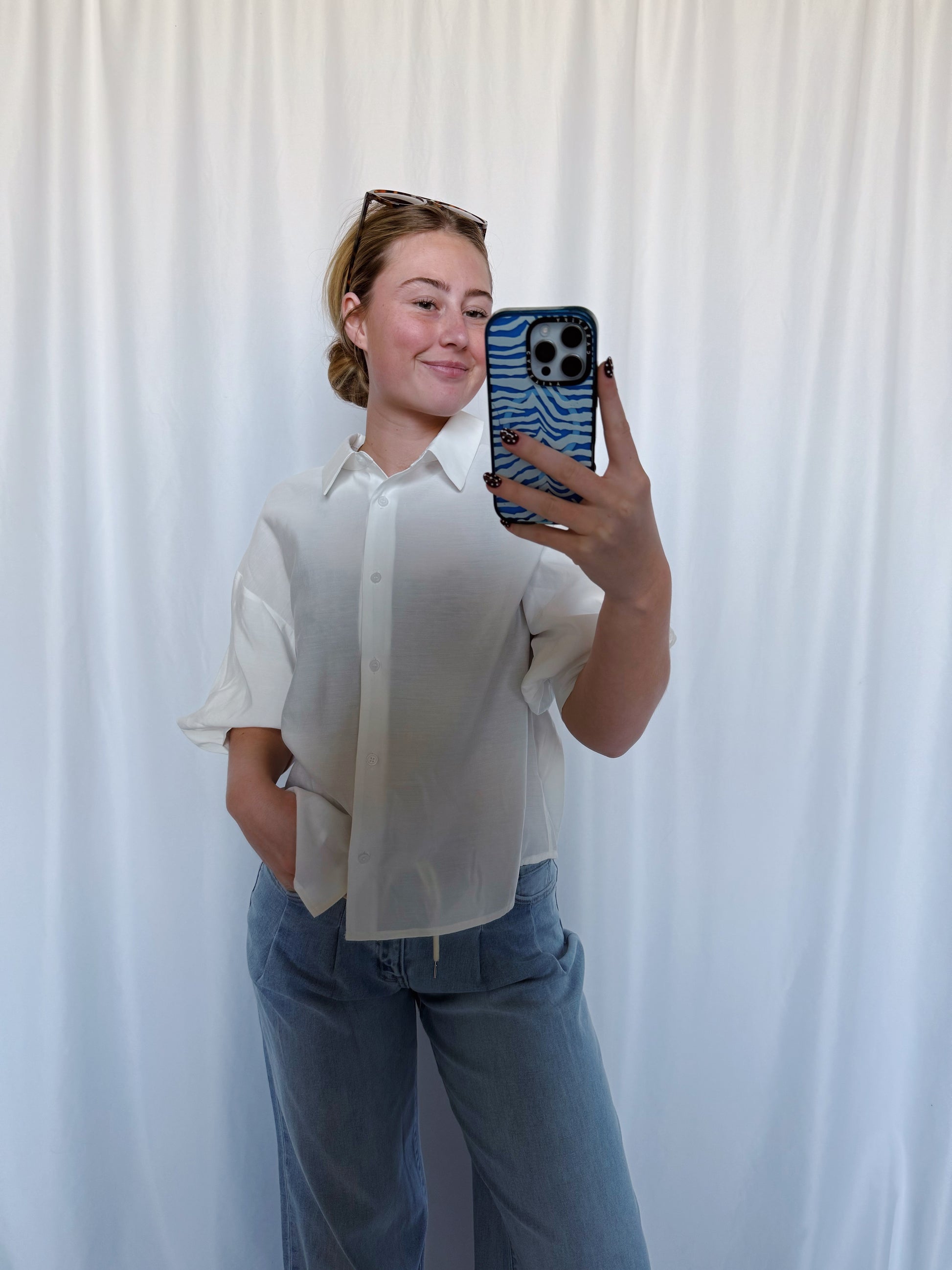 A lightweight white button-up with an easy, relaxed fit. Perfect for layering or wearing on its own. Reese is wearing a size small.