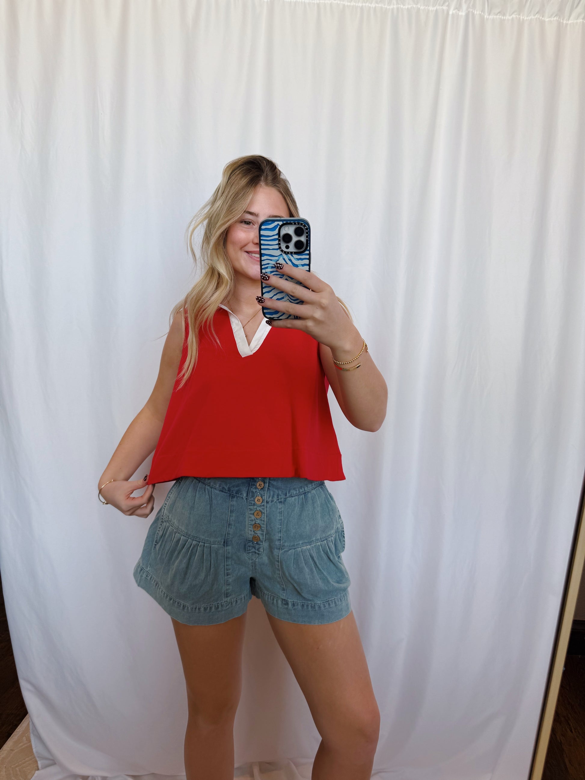 The Lennox Denim Shorts keep it simple but fun with a high-rise fit, button-front detail, and easy, lightweight denim.