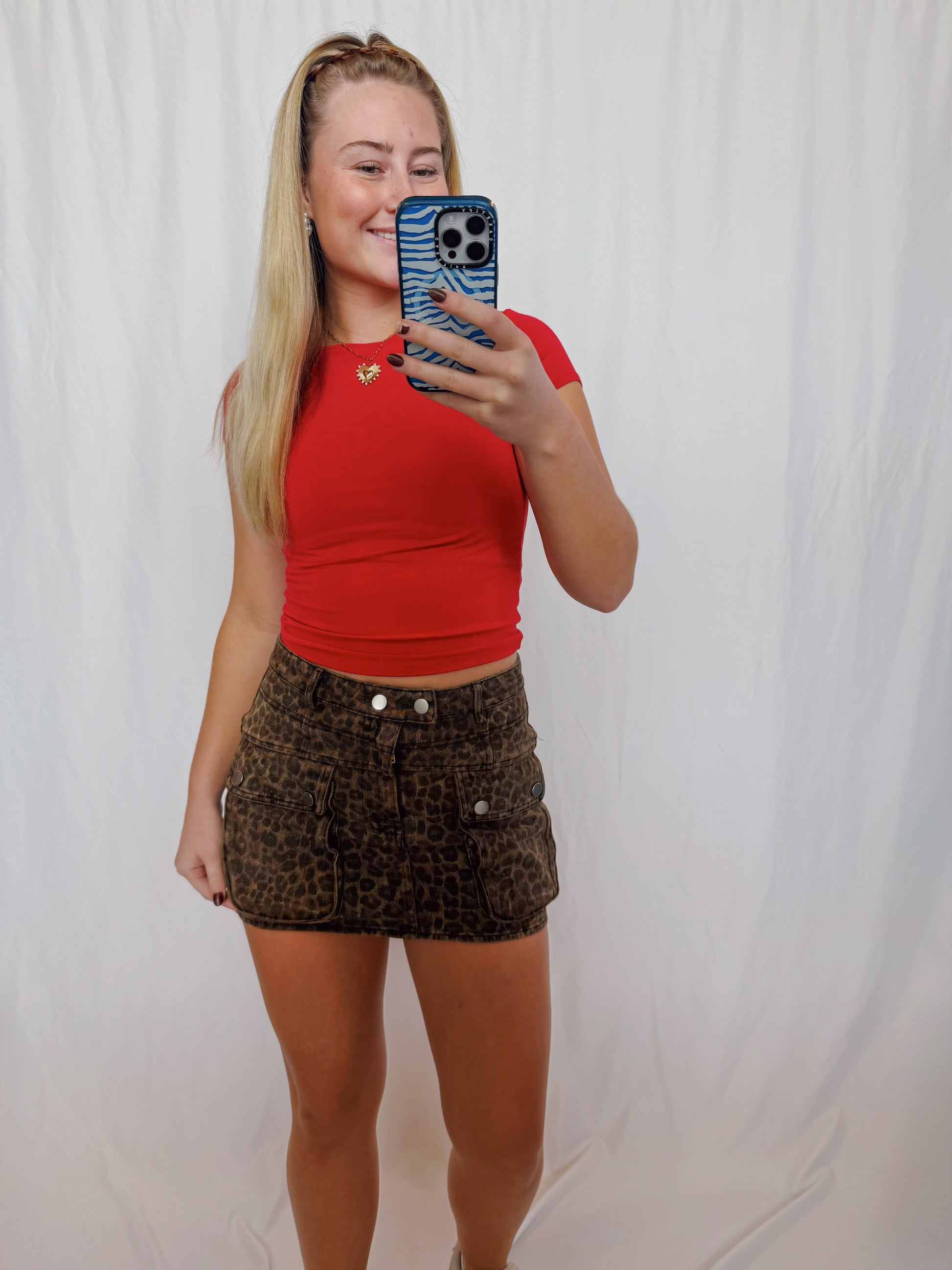 A mid-rise mini skirt in bold leopard print with pocket details. Easy to style and perfect for a night out and also gamedays!